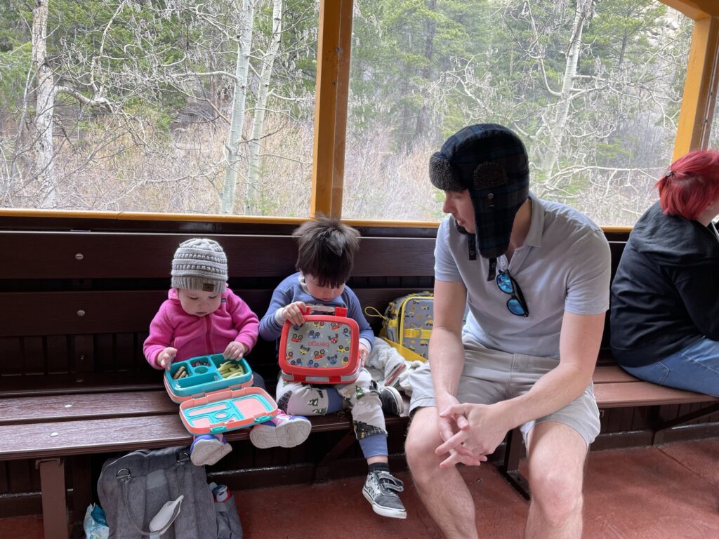We messed up and let our springtime loving boy choose shorts over pants and didn’t bring enough layers to keep him warm… one really cool pair of train Jammies ended up being a lesson learned for us. The cabins have windows open so you can take in the views. Looked like everyone was fairly prepared to be cold except for my husband and son haha!